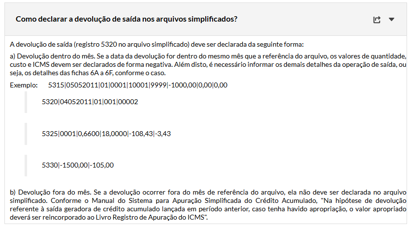 Este tópico visa atender os cenários em que houverem, na escrituração fiscal do contribuinte, operações de devoluções de saídas, cuja operação anterior tenha sido considerada geradora de Crédito Acumulado (com Enquadramento Legal).