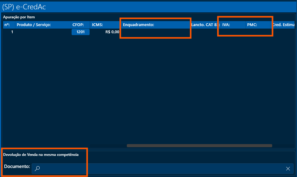 Diante do exposto acima, faz-se necessário anular o efeito da saída original na apuração do Crédito Acumulado, para que ele não seja indevidamente apropriado. Para esta finalidade, deve-se aplicar o mesmo Enquadramento Lega, IVA e PMC utilizado na saída original, desde que seja na mesma competência.