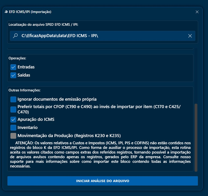Alimentado o saldo inicial de estoque, proceda a partir de então com a importação do SPED Fiscal ICMS/IPI do período que deseja realizar o trabalho de levantamento do crédito acumulado de ICMS passível de pedido de apropriação. Na central de importação, deverá ser escolhido a opção EFD ICMS/IPI. Fazer a importação considerando o registro por itens de documentos, para que seja possível, a partir da planilha inicial de estoque imputada conforme passo 3, que o sistema tenha informações suficientes para calcular o estoque por conta própria a partir de então;