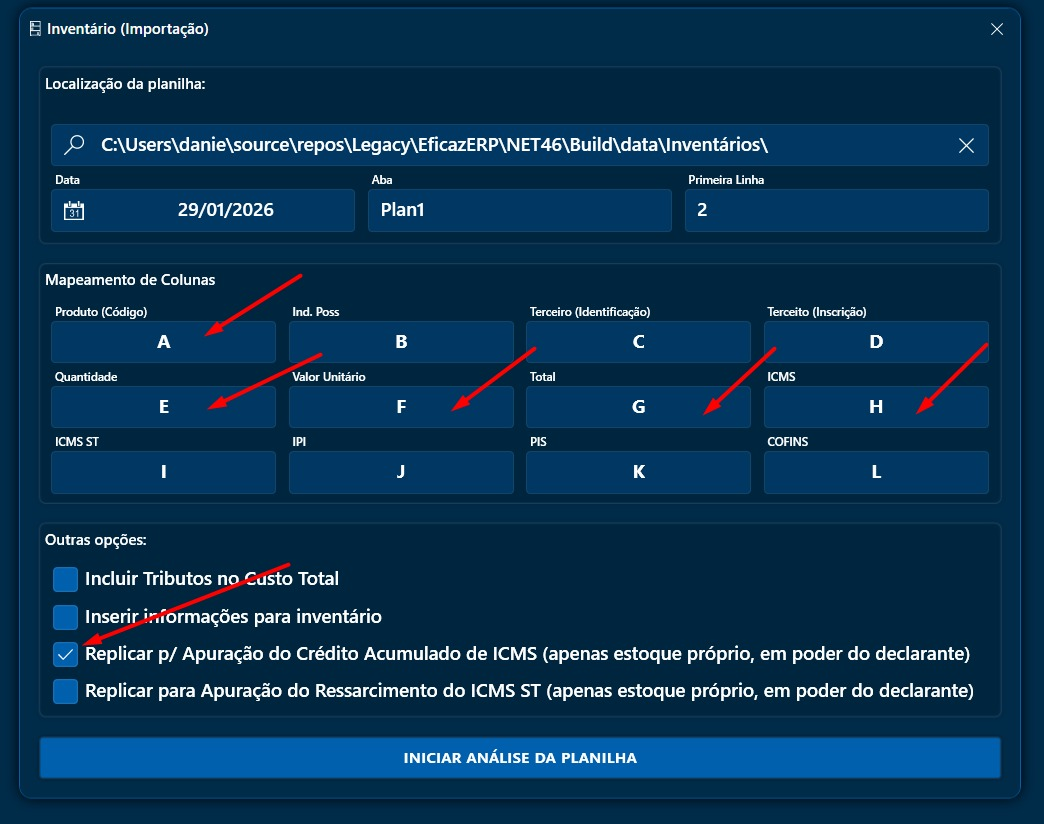 Na tela acima, efetuar o mapeamento das colunas da planilha que contenham as informações de acordo com a relação do estoque inicial. Os campos da tela acima que não tiverem informações, preencher com algo arbitrário, por exemplo "ZZ", de forma que seja ignorado por serem colunas irrelevantes para o trabalho;