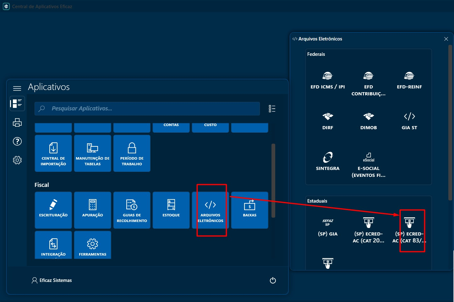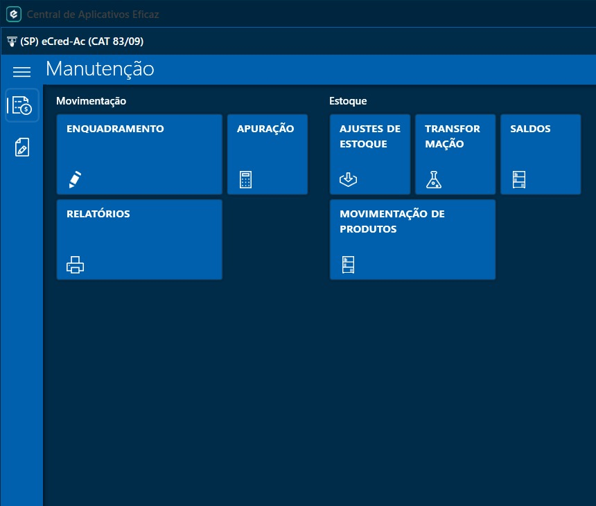 Para iniciar, acesse o Menu Iniciar da aplicação, clique em "Arquivo Eletrônicos (grupo fiscal) e em seguida inicie a rotina "(SP) eCredAc (CAT 83/09):