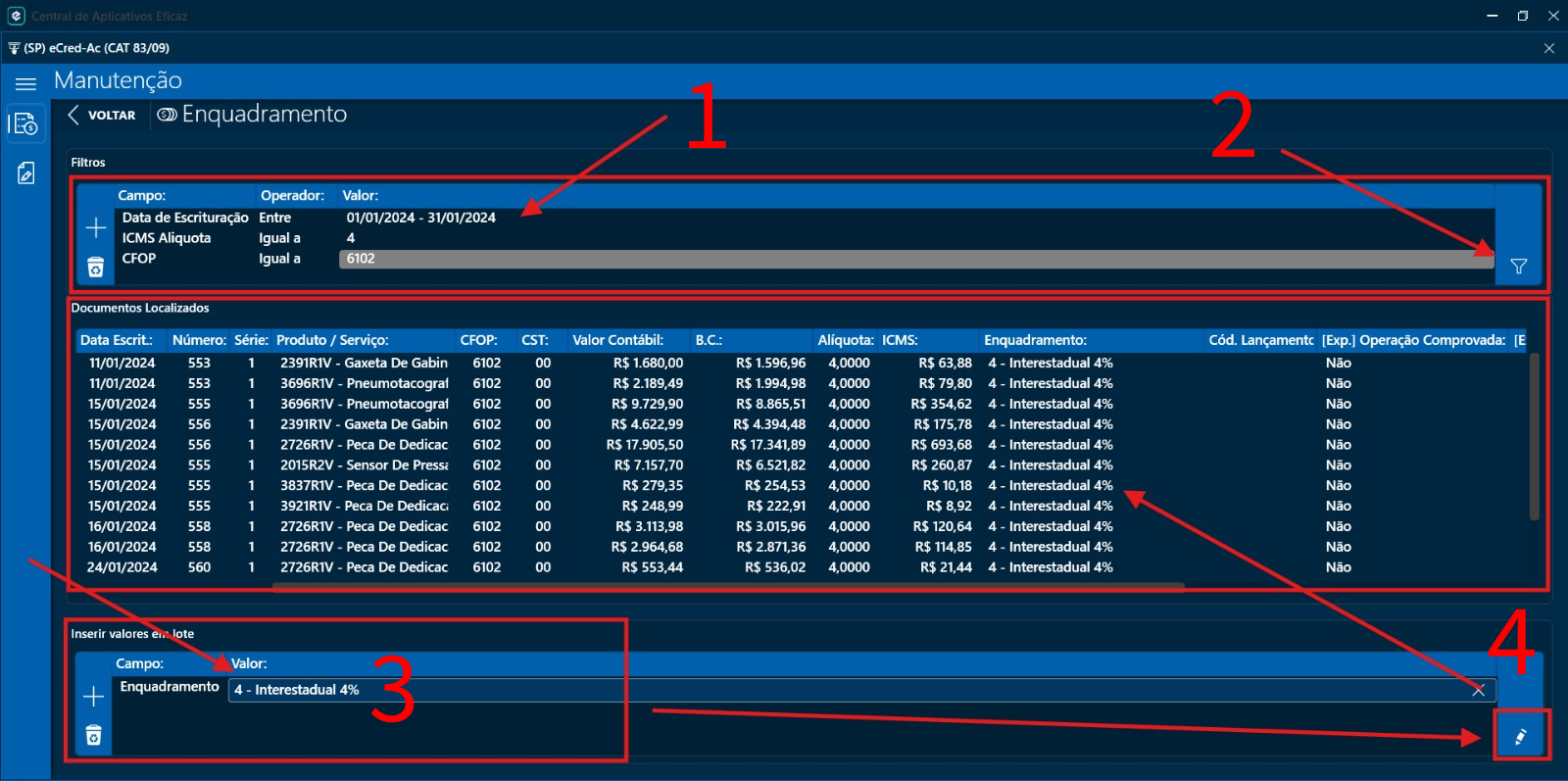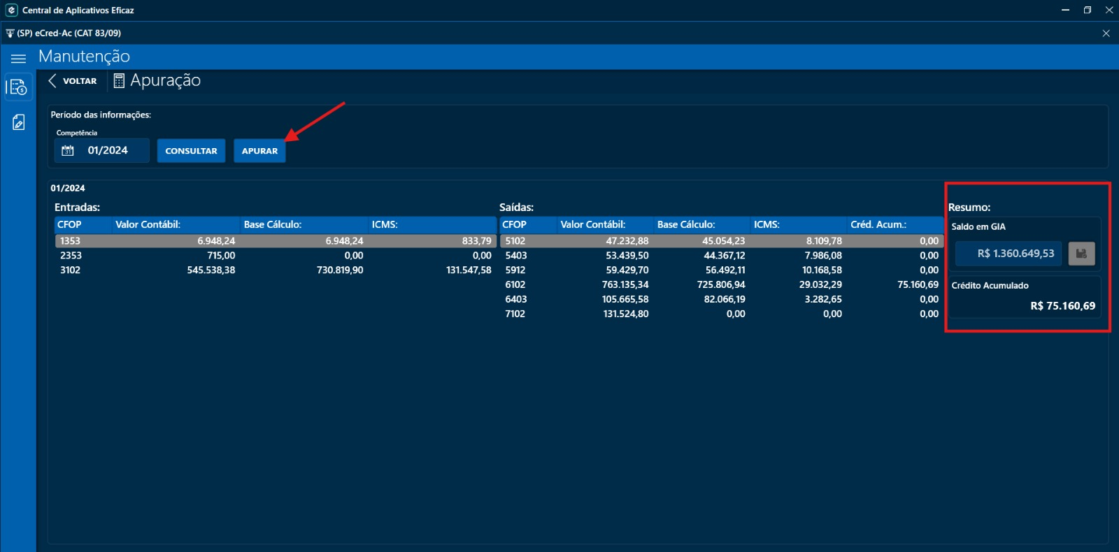 Ao realizar essa operação, todos os itens de saída serão registrados para fins de executar o enquadramento legal nos documentos de saída que ensejam a condição de acúmulo de ICMS na empresa consulente;